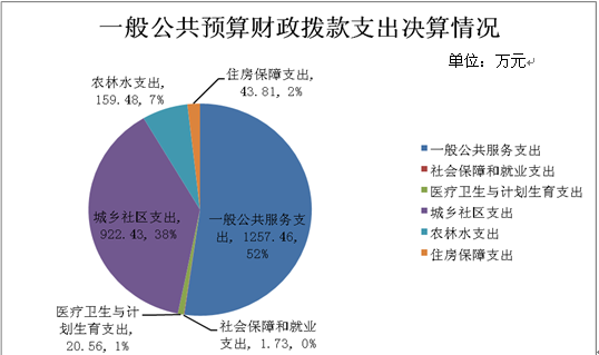 bet365手机网址多少2016年一般公共预算财政拨款支出2405.47万元,主要用于以下方面:一般公共服务支出1257.46万元,占52.28%;社会保障和就业支出1.73万元,占0.07%;医疗卫生与计划生育支出20.56万元,占0.85%;城乡社区支出922.43万元,占38.35%;农林水支出159.48万元,占6.63%;住房保障支出43.81万元,占1.82%。