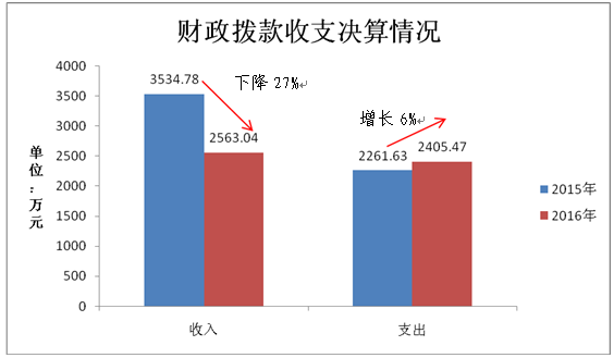 bet365手机网址多少2016年度财政拨款收支总决算2563.04万元/ 2405.47万元。财政拨款收入较2015年减少971.74万元,同比下降27%;财政拨款支出较2015年增加143.84万元, 同比增长6%。(柱状图)