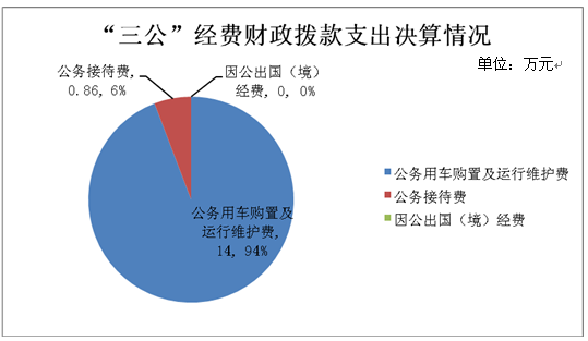 2016年度“三公”经费财政拨款支出决算中,因公出国(境)费支出决算0万元,占0%;公务用车购置及运行维护费支出决算14万元,占94.21%;公务接待费支出决算0.86万元,占5.79%。具体情况如下: